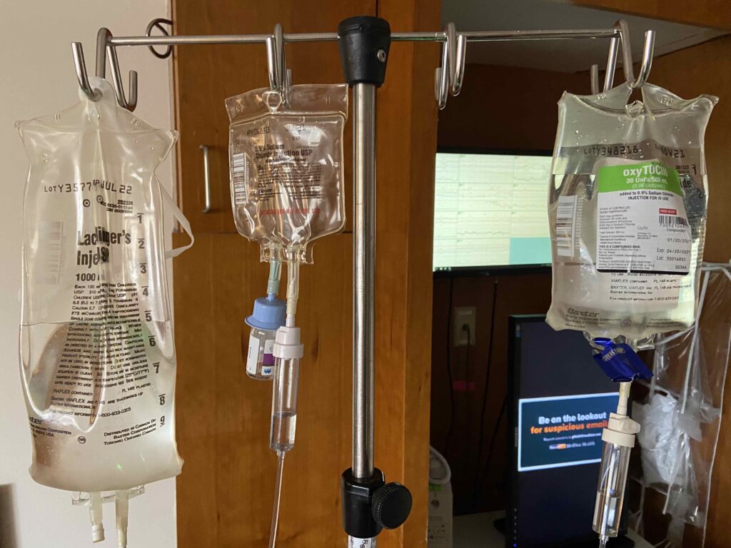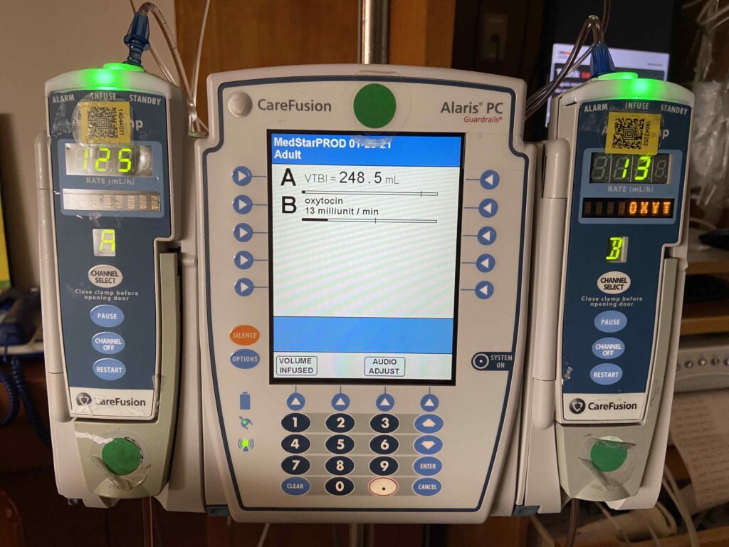 For non-medical experts (raises hand), Pitocin, according to John Hopkins, has a few uses during pregnancy but in this specific case is a drug used to stimulate contractions. This hormone is given continuously through an IV typically starting a very low dose and slowly increasing over several hours. Overnight, Lara started at one milliliter per minute; she is now at 13-14 mL.